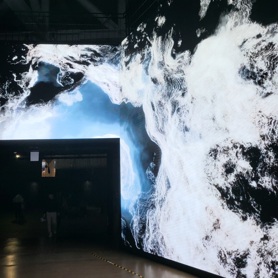 전시회장에 들어가니 눈을 사로잡는 미디어아트가 광대한 스크린에 펼쳐져 있었습니다.